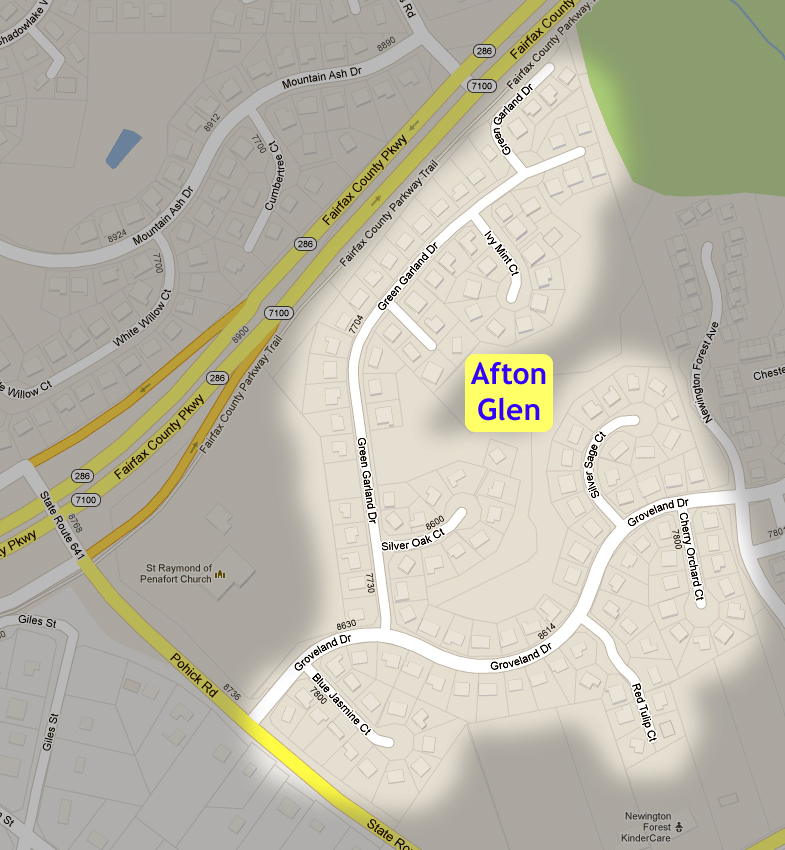 Our community is located in southwestern Fairfax County, VA, near the intersection of Pohick Road (SR 641) and the Fairfax County Parkway (SR 286, formerly SR 7100). For a map of Afton Glen, click here. |